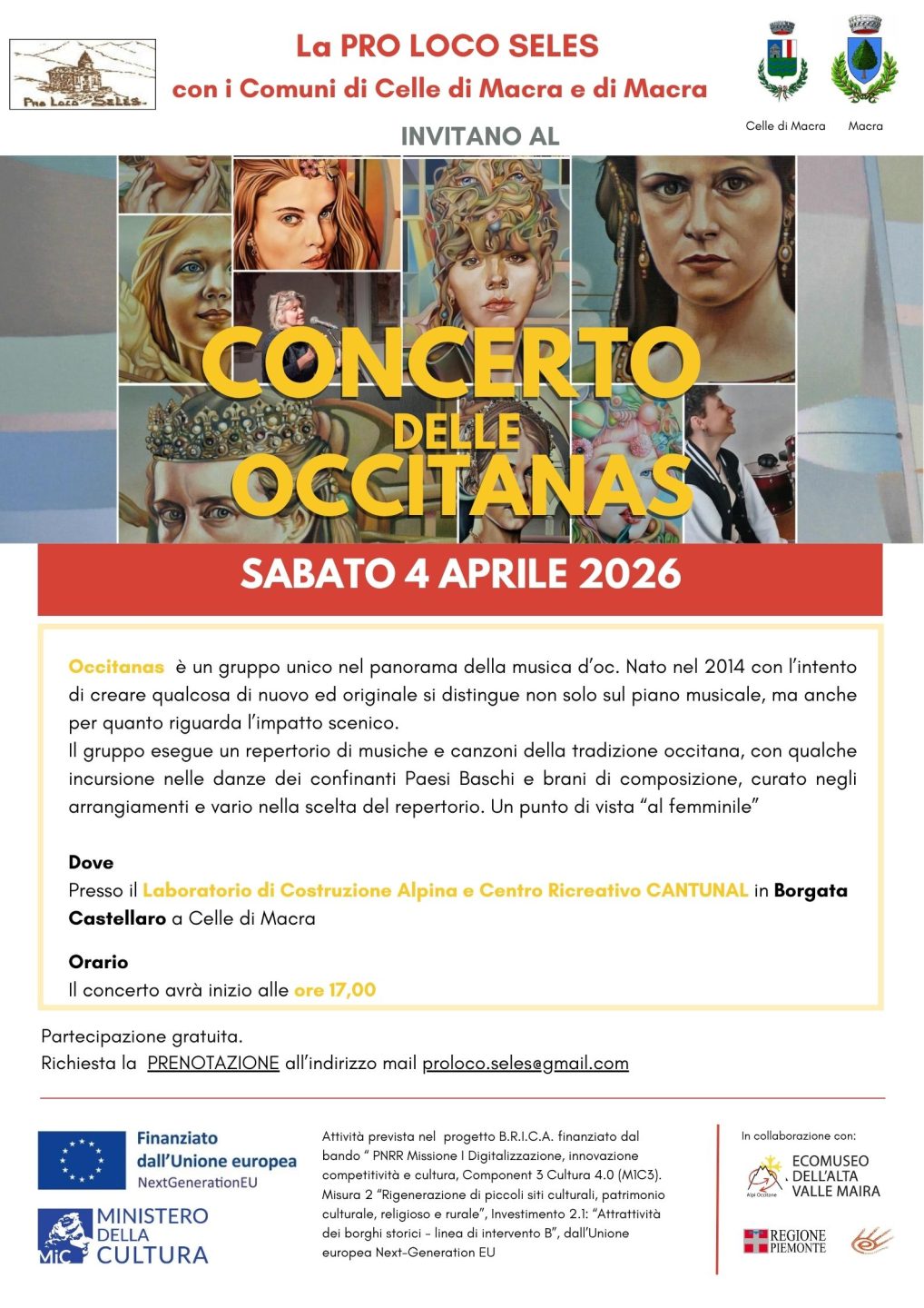 Primo appuntamento musicale della stagione primaverile con il concerto del gruppo “OCCITANAS” che si terrà sabato 4 aprile alle ore 17.00 a Celle di Macra, presso Borgata Castellaro nella suggestiva location del CANTUNAL: Centro ricreativo e Laboratorio di costruzione alpina.