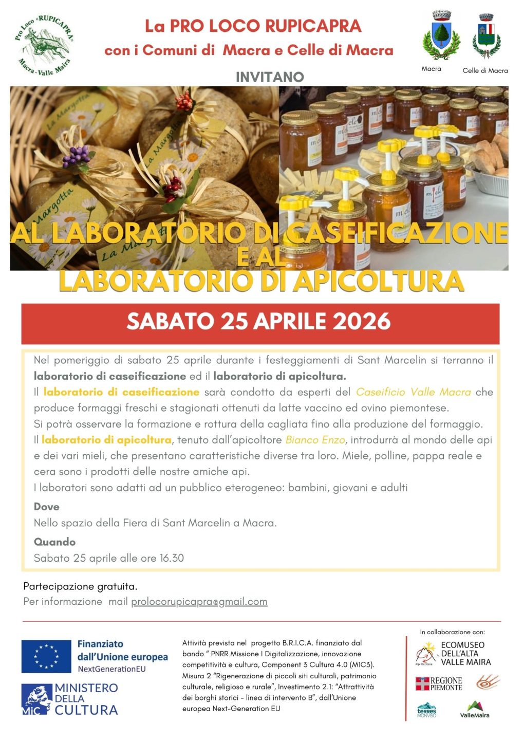 Sabato 25 APRILE a MACRA, alle ore 16.30 verranno proposti un Laboratorio di Caseificazione ed un Laboratorio di Apicoltura rivolti ad un pubblico eterogeneo quali bambini, ragazzi e adulti.