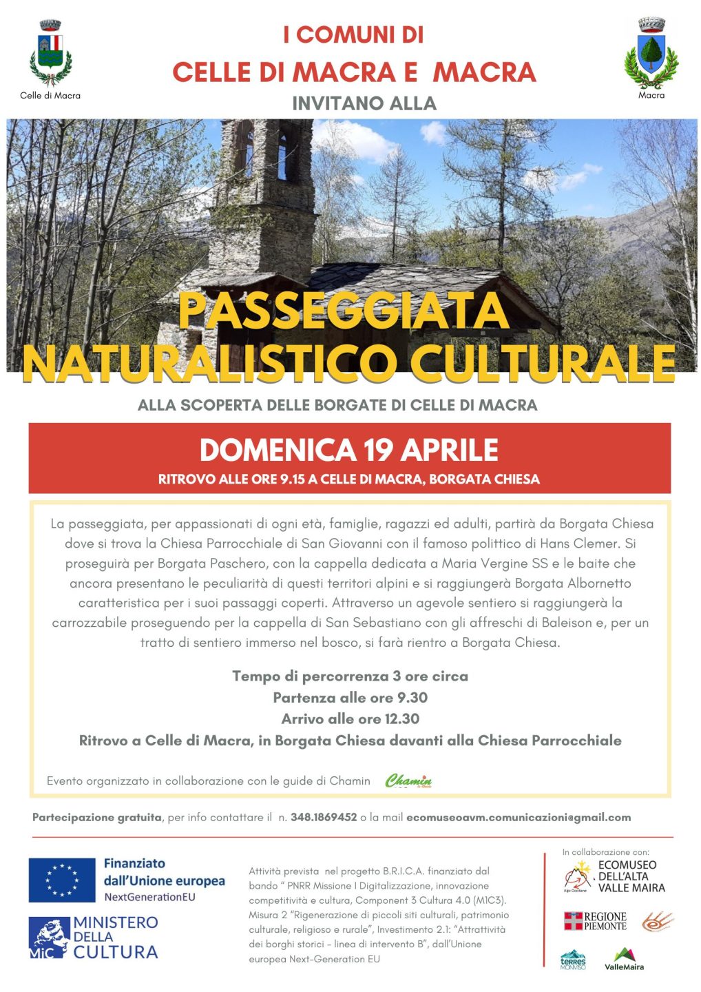 Domenica 19 aprile 2026 alle ore 9.15 a Borgata Chiesa di Celle di Macra vi sarà il primo appuntamento con le passeggiate naturalistico culturali alla scoperta del territorio dei comuni dell’Ecomuseo ed in particolare di Celle di Macra e di Macra.